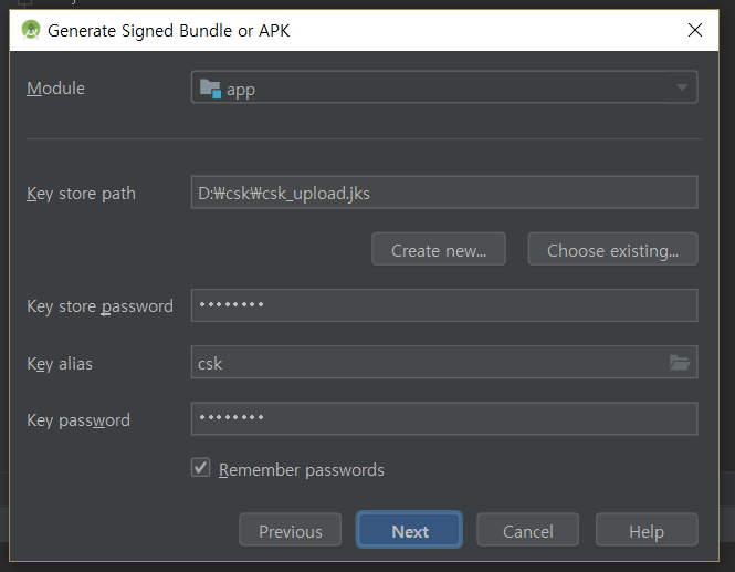 기존에 만들어둔 key store를 선택하고 password를 입력하면 Key alias에서 key를 선택할 수 있고 이후 key의 password를 입력하면 된다. 이때 key store password가 틀리면 key alias를 선택할 수 없다. key password가 다르다면 서명이 실패한다.